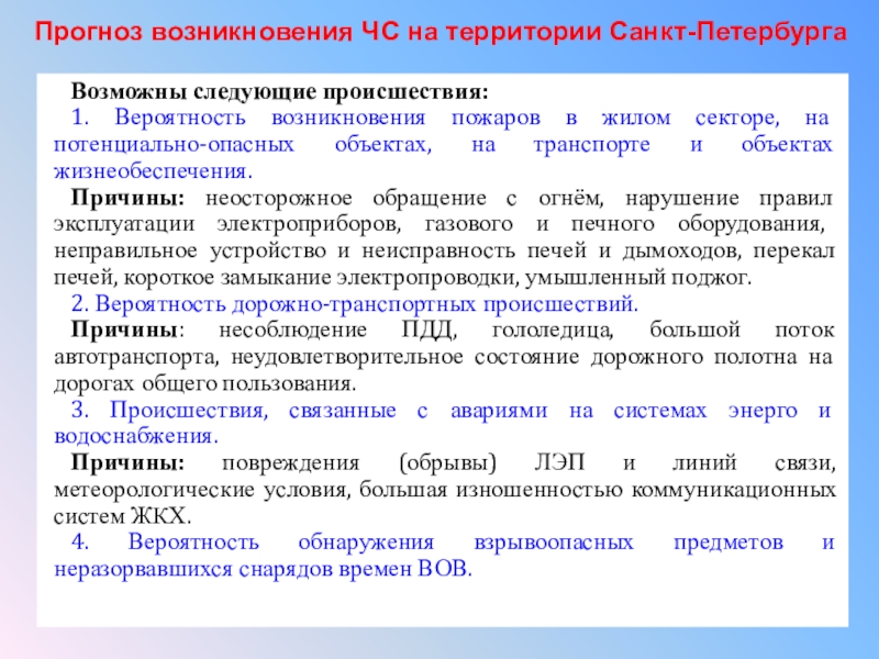 Прогноз возникновения ЧС на территории Санкт-Петербурга