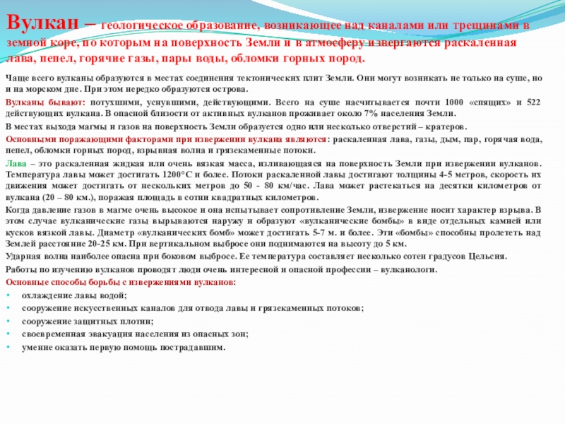 Основными поражающими факторами при извержении вулкана являются: раскаленная лава, газы, дым, пар, горячая вода, пепел, обломки горных пород, взрывная волна и грязекаменные потоки.