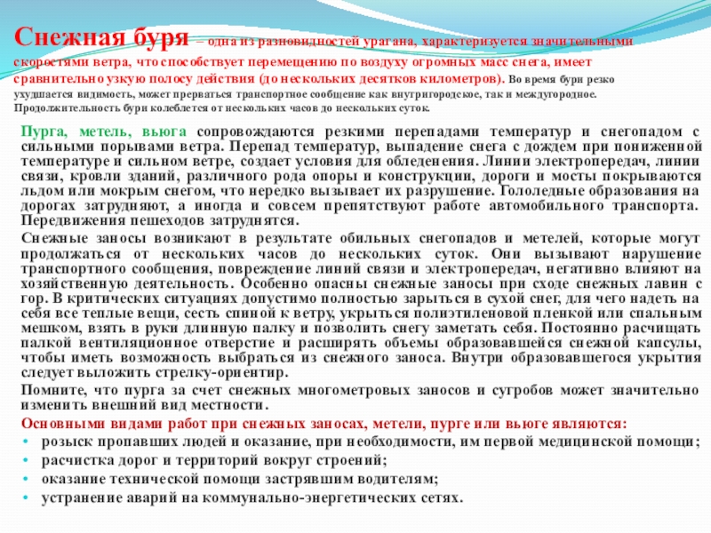 Основными видами работ при снежных заносах, метели, пурге или вьюге являются:
