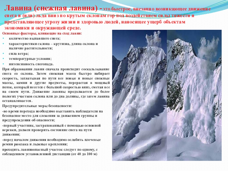 При образовании лавин сначала происходит соскальзывание снега со склона. Затем снежная масса быстро набирает скорость, захватывая по пути все новые и новые снежные массы, камни и другие предметы, перерастая в мощный поток, который несется с большой скоростью вниз, сметая все на своем пути. Движение лавины продолжается до более пологих участков склона или до дна долины, где затем лавина останавливается.