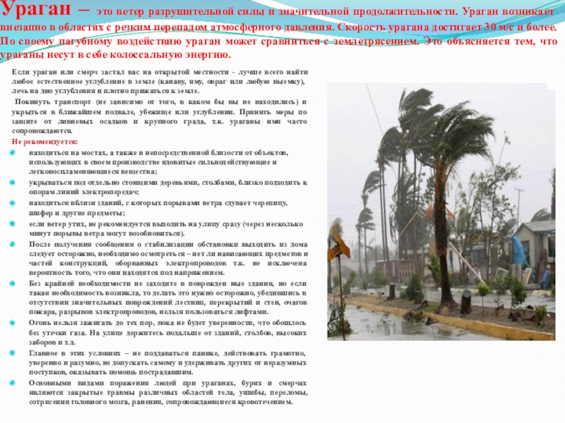 Основными видами поражения людей при ураганах, бурях и смерчах являются закрытые травмы различных областей тела, ушибы, переломы, сотрясения головного мозга, ранения, сопровождающиеся кровотечением.