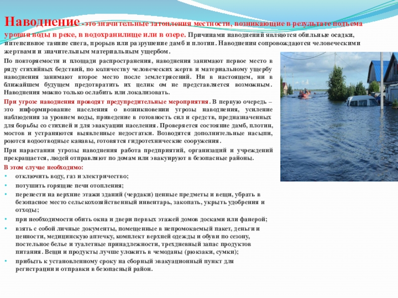 По повторяемости и площади распространения, наводнения занимают первое место в ряду стихийных бедствий, по количеству человеческих жертв и материальному ущербу наводнения занимают второе место после землетрясений. Ни в настоящем, ни в ближайшем будущем предотвратить их целик ом не представляется возможным. Наводнения можно только ослабить или локализовать.