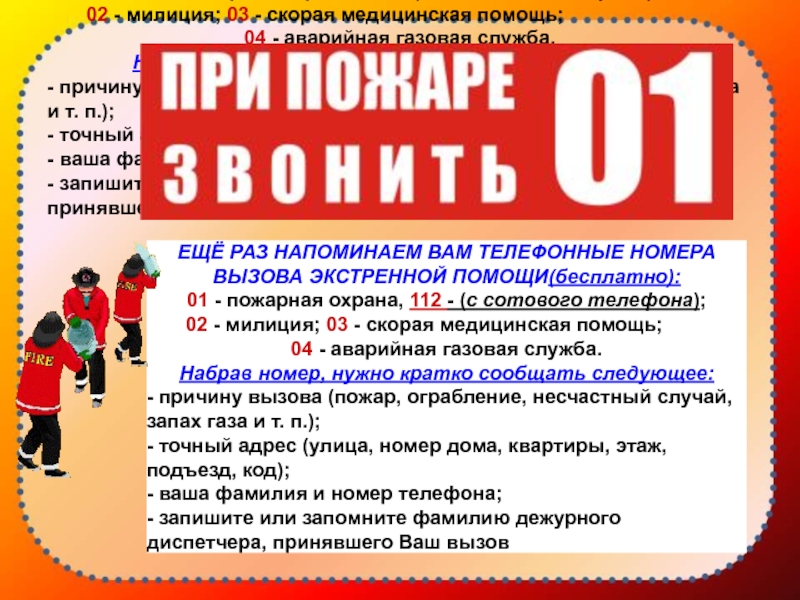 02 - милиция; 03 - скорая медицинская помощь;
