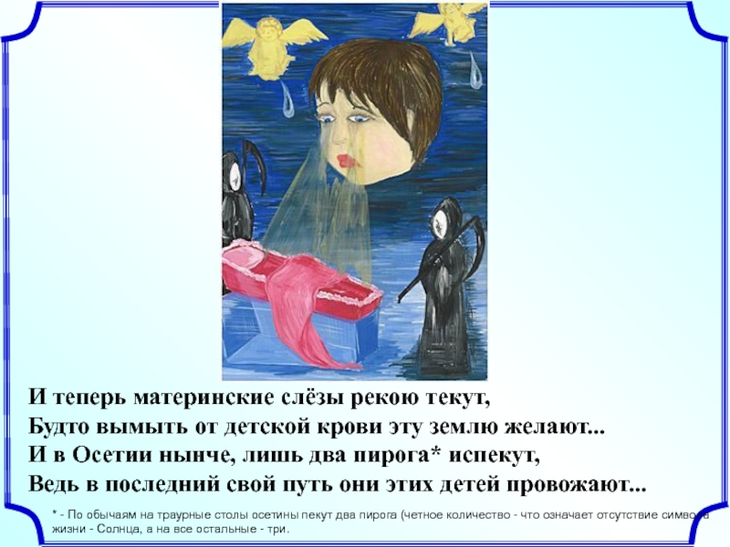 * - По обычаям на траурные столы осетины пекут два пирога (четное количество - что означает отсутствие символа жизни - Солнца, а на все остальные - три.