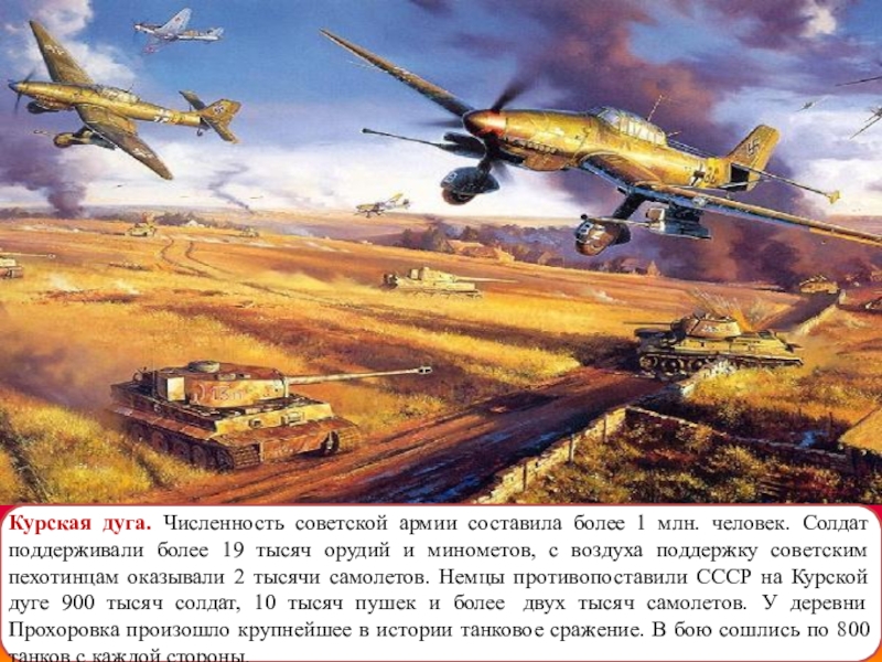 поддерживали более 19 тысяч орудий и минометов, с воздуха поддержку советским пехотинцам оказывали 2 тысячи самолетов. Немцы противопоставили СССР на Курской дуге 900 тысяч солдат, 10 тысяч пушек и более двух тысяч самолетов. У деревни Прохоровка произошло крупнейшее в истории танковое сражение. В бою сошлись по 800 танков с каждой стороны.