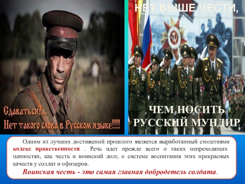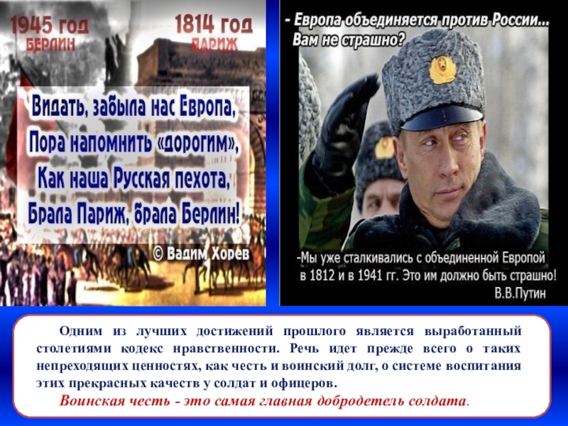 Речь идет прежде всего о таких непреходящих ценностях, как честь и воинский долг, о системе воспитания этих прекрасных качеств у солдат и офицеров.