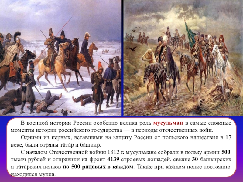 С началом Отечественной войны 1812 г. мусульмане собрали в пользу армии 500 тысяч рублей и отправили на фронт 4139 строевых лошадей. свыше 30 башкирских и татарских полков по 500 рядовых в каждом. Также при каждом полке постоянно находился мулла.