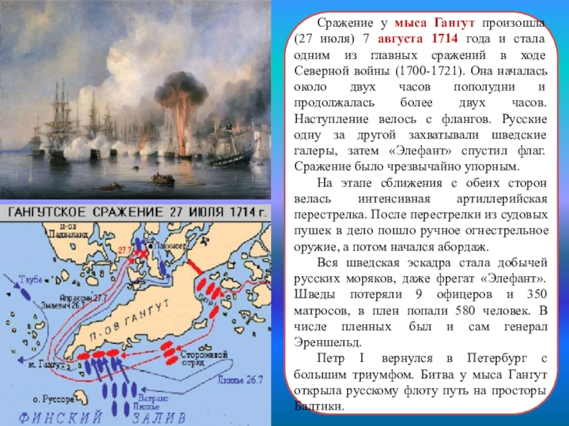 Сражение у мыса Гангут произошла (27 июля) 7 августа 1714 года