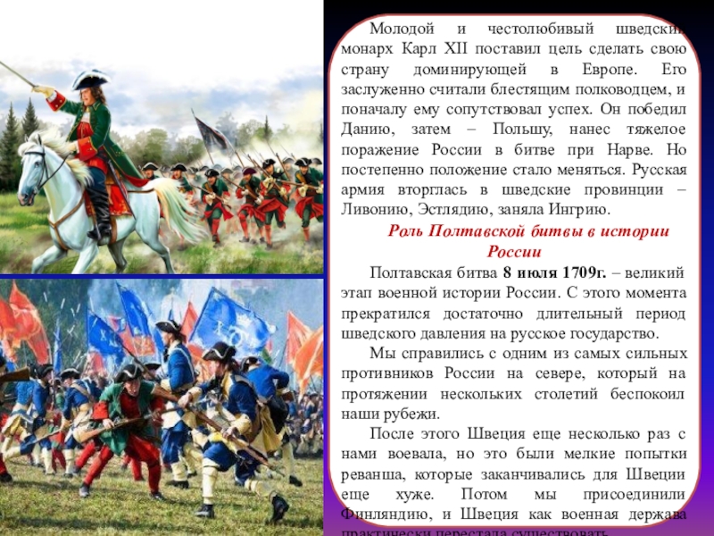 страну доминирующей в Европе. Его заслуженно считали блестящим полководцем, и поначалу ему сопутствовал успех. Он победил Данию, затем – Польшу, нанес тяжелое поражение России в битве при Нарве. Но постепенно положение стало меняться. Русская армия вторглась в шведские провинции – Ливонию, Эстлядию, заняла Ингрию.