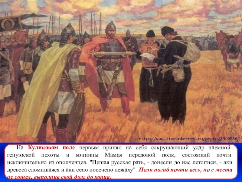 На Куликовом поле первым принял на себя сокрушающий удар наемной генуэзской