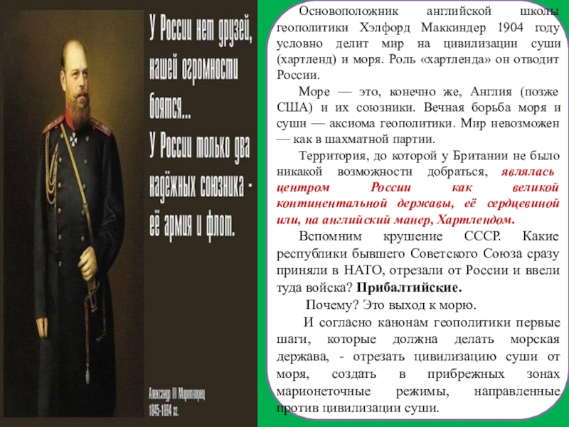 Территория, до которой у Британии не было никакой возможности добраться, являлась центром России как великой континентальной державы, её сердцевиной или, на английский манер, Хартлендом.