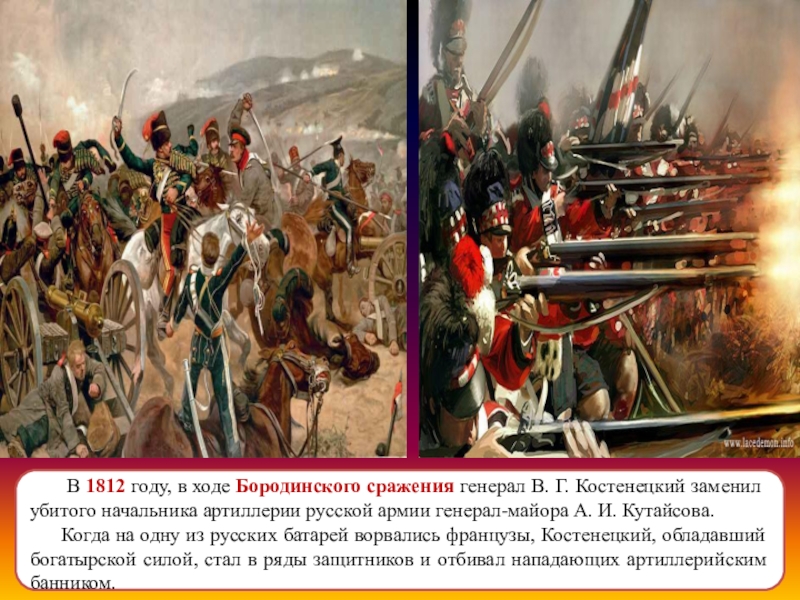 Костенецкий заменил убитого начальника артиллерии русской армии генерал-майора А. И. Кутайсова.