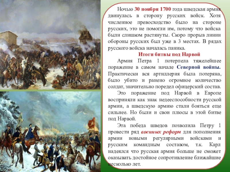 Эта победа шведов позволила Петру 1 провести ряд военных реформ для пополнения армии новыми регулярными войсками и русским командным составом, т.к. Карл надеялся что русская армия больше не сможет оказывать достойное сопротивление ближайшие несколько лет.