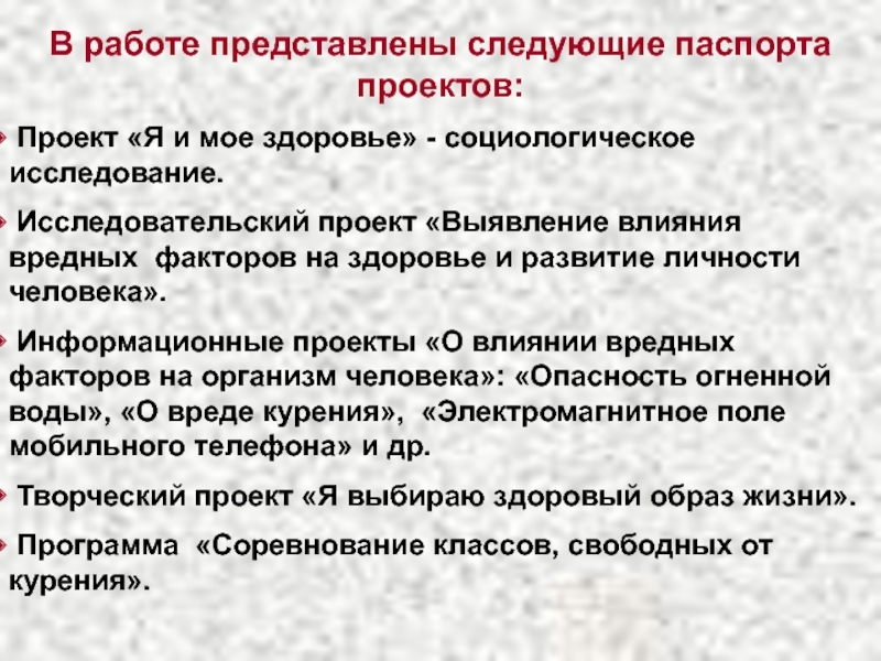 Слайд 9В работе представлены следующие паспорта проектов: