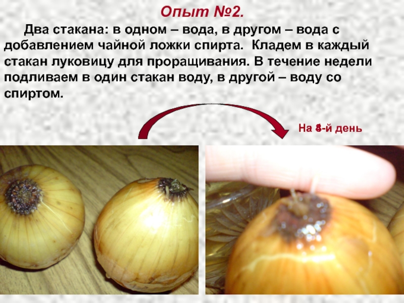 вода с добавлением чайной ложки спирта. Кладем в каждый стакан луковицу для проращивания. В течение недели подливаем в один стакан воду, в другой – воду со спиртом.