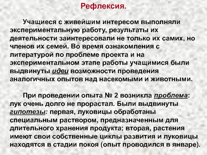 лук очень долго не прорастал. Были выдвинуты гипотезы: первая, луковицы обработаны специальным раствором, предназначенным для длительного хранения продукта; вторая, растения имеют свои собственные циклы развития и луковицы находятся в стадии покоя (опыт проводился в январе).