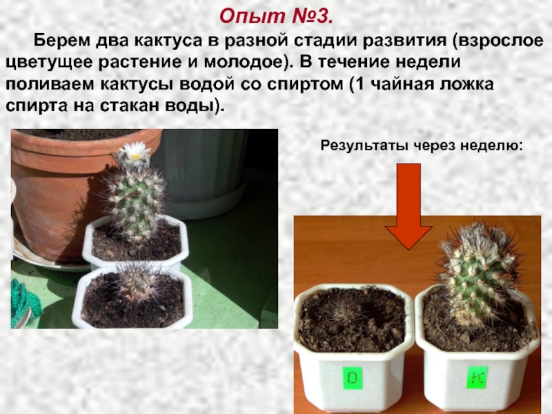 Опыт №3 показал, что спирт по-разному действует на живые организмы, находящиеся в разной стадии развития. Молодое растение погибает быстрее, чем взрослое.