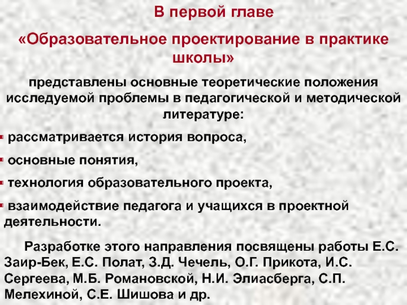 Разработке этого направления посвящены работы Е.С. Заир-Бек, Е.С. Полат, З.Д. Чечель, О.Г. Прикота, И.С. Сергеева, М.Б. Романовской, Н.И. Элиасберга, С.П. Мелехиной, С.Е. Шишова и др.
