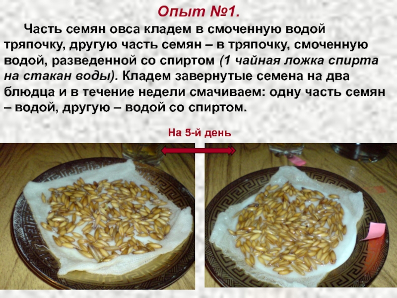 часть семян – в тряпочку, смоченную водой, разведенной со спиртом (1 чайная ложка спирта на стакан воды). Кладем завернутые семена на два блюдца и в течение недели смачиваем: одну часть семян – водой, другую – водой со спиртом.