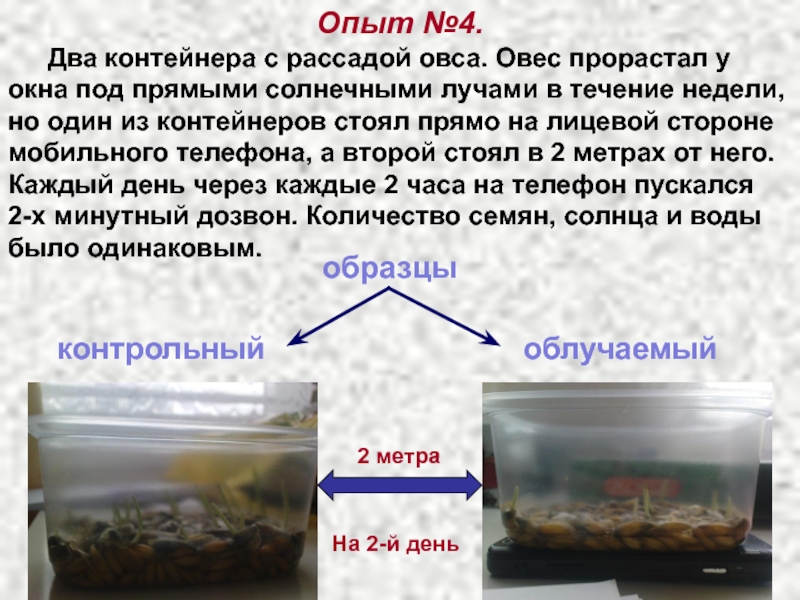 Опыт №4. Оба образца: контрольный и облучаемый имели одинаковые условия существования. Количество семян, солнца и воды было одинаковым, но уже через 5 дней было явно видно, что намного меньше прорастают семена, стоявшие на мобильном телефоне, нежели семена из контрольного контейнера.