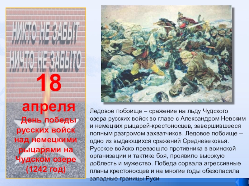 18 апреля - День победы русских воинов князя Александра Невского над немецкими рыцарями на Чудском озере (Ледовое побоище, 1242 год);