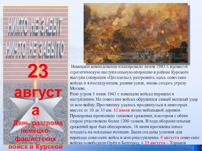23августаДень разгрома немецко-фашистских войск в Курской битве (1943 год) Немецкое командование планировало летом 1943 г. провести стратегическую