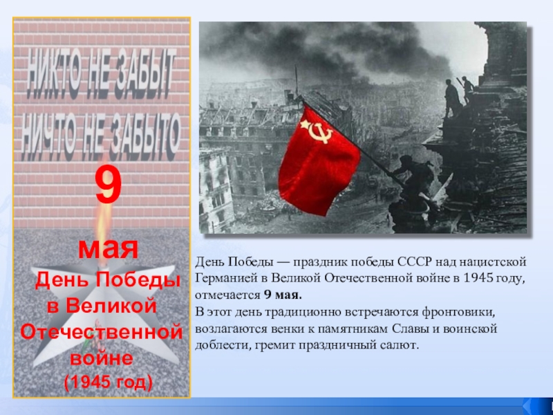 9маяДень Победы в Великой Отечественной войне(1945 год)День Победы — праздник победы СССР над нацистской Германией в Великой