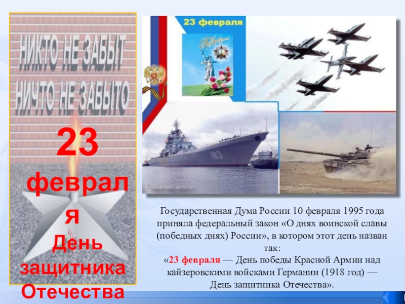 23февраляДень защитника Отечества.Государственная Дума России 10 февраля 1995 года приняла федеральный закон «О днях воинской славы (победных