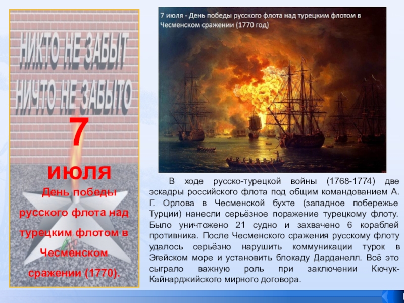 День победы русского флота над турецким флотом в Чесменском сражении (1770).