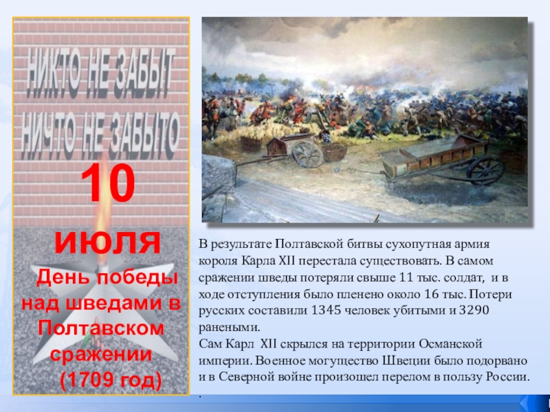 10июляДень победы над шведами в Полтавском сражении (1709 год)В результате Полтавской битвы сухопутная армия короля Карла XII
