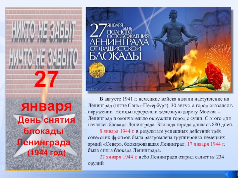 27январяДень снятия блокады Ленинграда(1944 год) В августе 1941 г. немецкие войска начали наступление на Ленинград (ныне Санкт-Петербург).