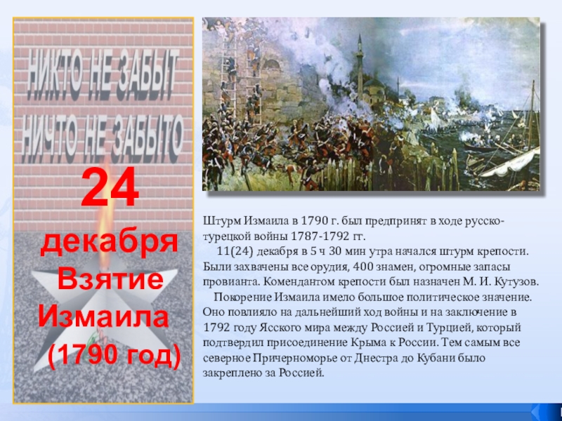 24декабряВзятие Измаила (1790 год)Штурм Измаила в 1790 г. был предпринят в ходе русско-турецкой войны 1787-1792 гг.
