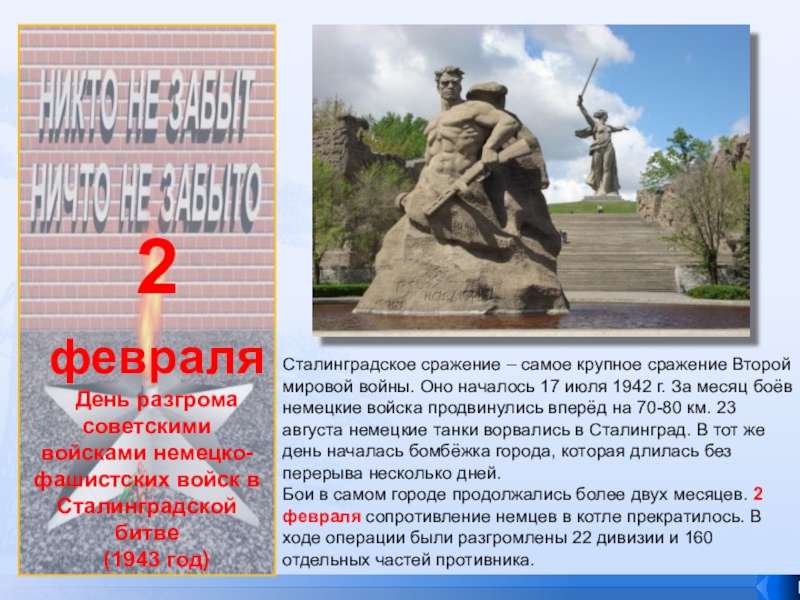2февраляДень разгрома советскими войсками немецко-фашистских войск в Сталинградской битве(1943 год)Сталинградское сражение – самое крупное сражение Второй мировой