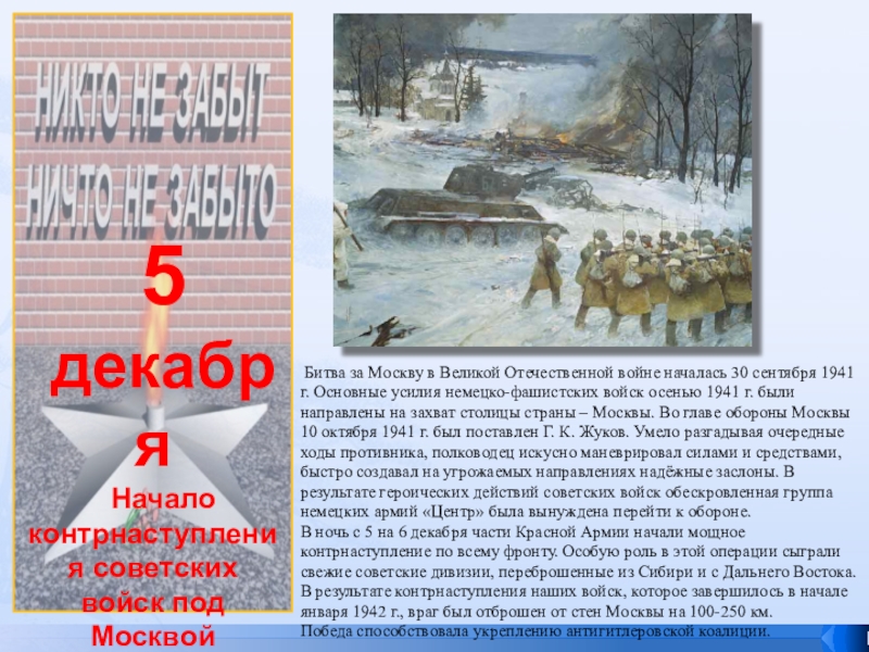 5 декабря -День начала контрнаступления советских войск против немецко-фашистских войск в битве под Москвой (1941год);
