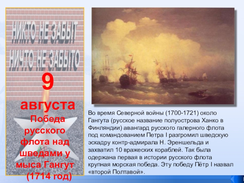 9 августа - День первой в российской истории морской победы русского флота под командованием Петра Первого над шведами у мыса Гангут (1714 год);