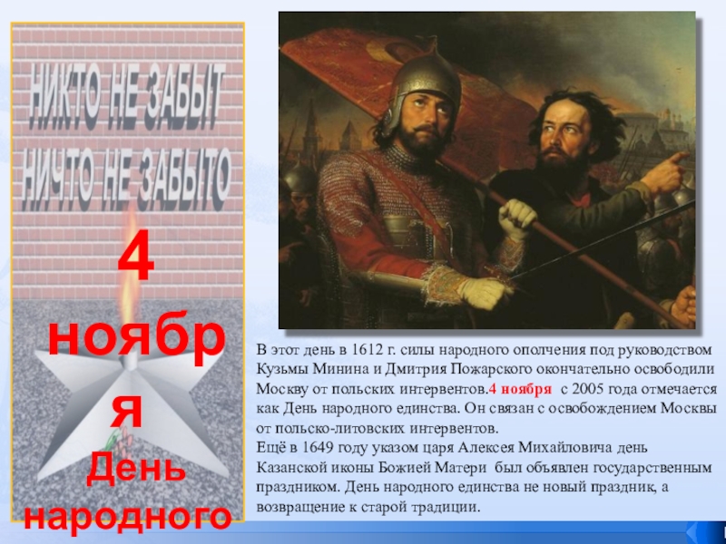 4ноябряДень народного единстваВ этот день в 1612 г. силы народного ополчения под руководством Кузьмы Минина и Дмитрия