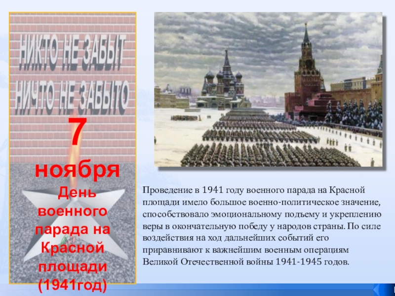 7ноябряДень военного парада на Красной площади (1941год)Проведение в 1941 году военного парада на Красной площади имело большое