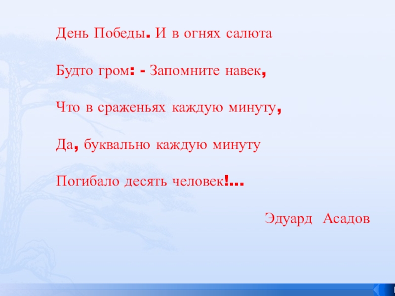 День Победы. И в огнях салютаБудто гром: - Запомните навек,Что в сраженьях каждую минуту,Да, буквально каждую минутуПогибало