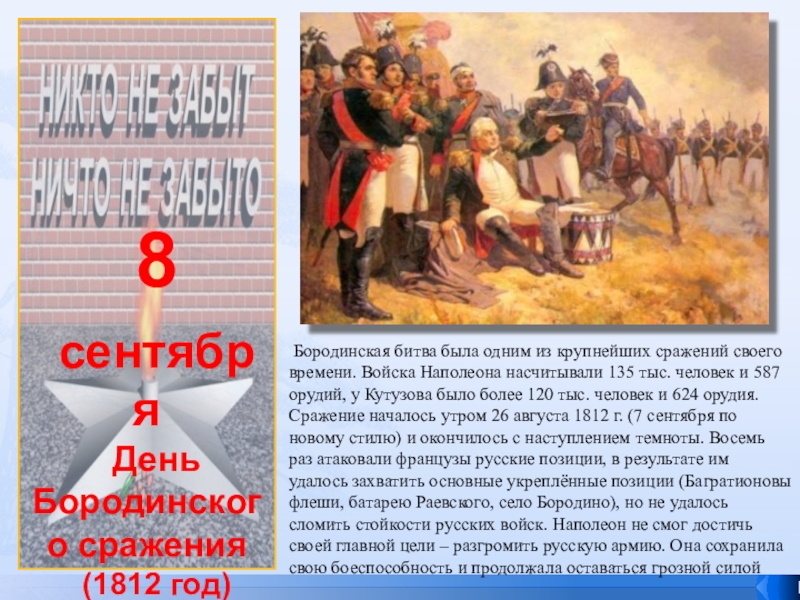8сентябряДень Бородинского сражения(1812 год) Бородинская битва была одним из крупнейших сражений своего времени. Войска Наполеона насчитывали 135