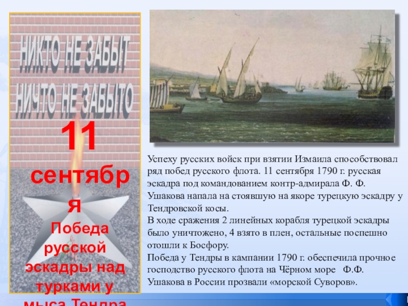11сентябряПобеда русской эскадры над турками у мыса Тендра (1790 год)Успеху русских войск при взятии Измаила способствовал ряд
