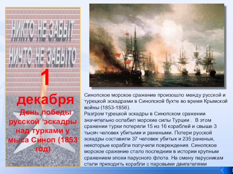 1декабряДень победы русской ‘эскадры над турками у мыса Синоп (1853 год)Синопское морское сражение произошло между русской и