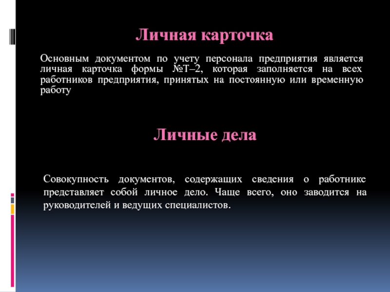 Совокупность документов, содержащих сведения о работнике представляет собой личное дело. Чаще всего, оно заводится на руководителей и ведущих специалистов.