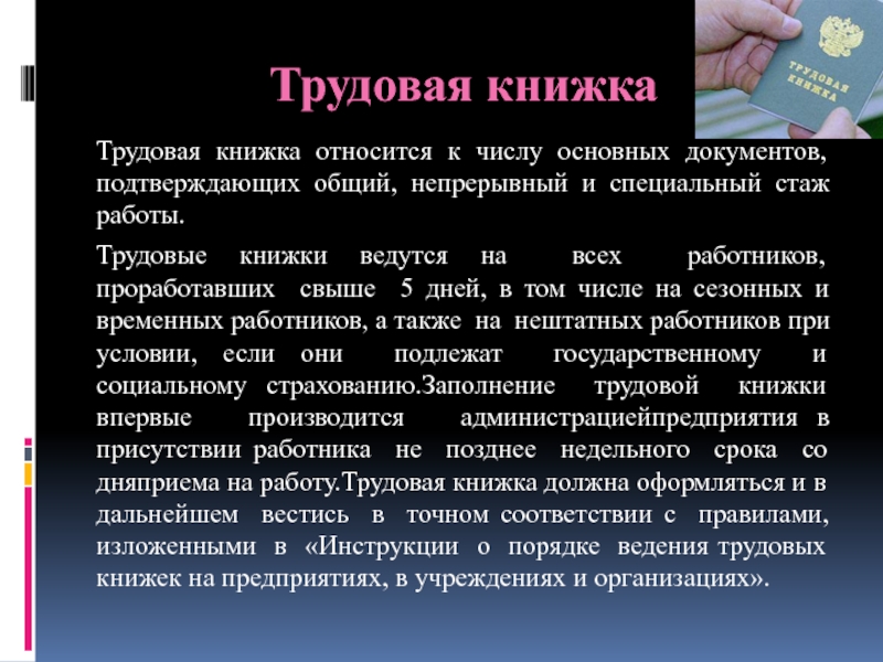 Трудовые книжки ведутся на всех работников, проработавших свыше 5 дней, в том числе на сезонных и временных работников, а также на нештатных работников при условии, если они подлежат государственному и социальному страхованию.Заполнение трудовой книжки впервые производится администрациейпредприятия в присутствии работника не позднее недельного срока со дняприема на работу.Трудовая книжка должна оформляться и в дальнейшем вестись в точном соответствии с правилами, изложенными в «Инструкции о порядке ведения трудовых книжек на предприятиях, в учреждениях и организациях».