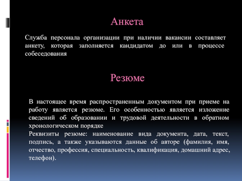 В настоящее время распространенным документом при приеме на работу является резюме. Его особенностью является изложение сведений об образовании и трудовой деятельности в обратном хронологическом порядке
