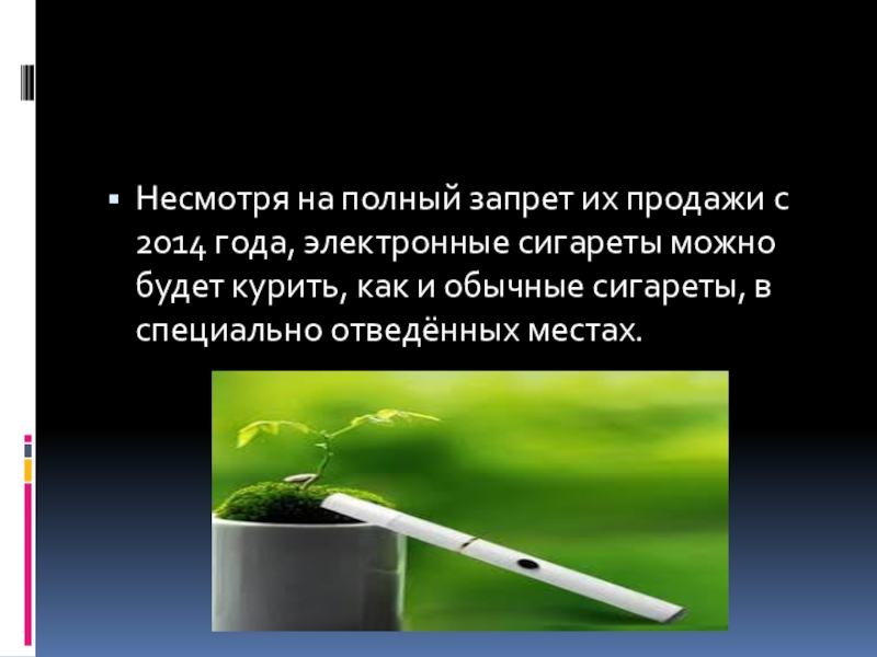 Слайд 18Несмотря на полный запрет их продажи с 2014 года, электронные сигареты