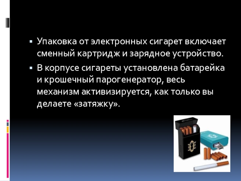 Слайд 3Упаковка от электронных сигарет включает сменный картридж и зарядное устройство.