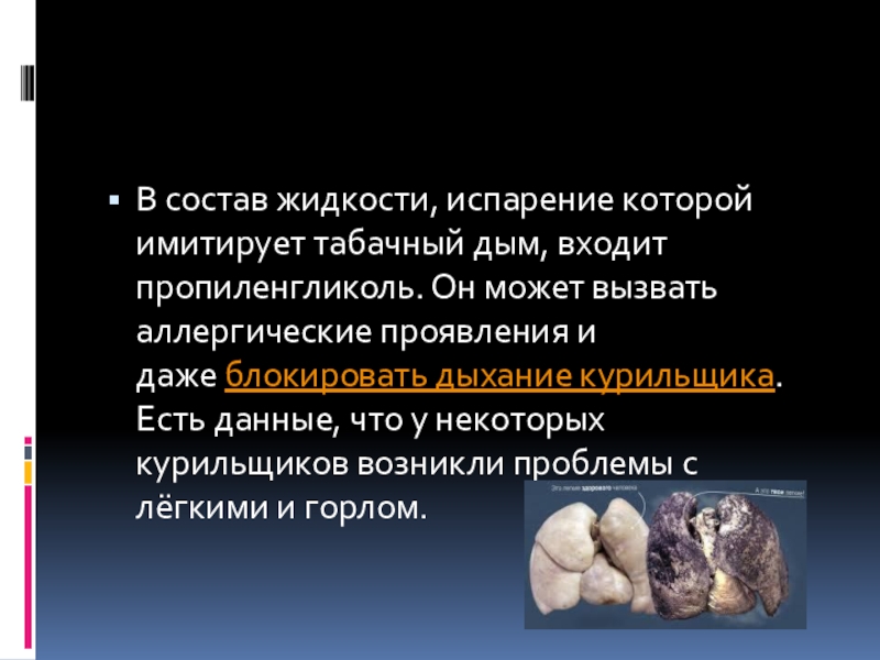 Слайд 13В состав жидкости, испарение которой имитирует табачный дым, входит пропиленгликоль. Он