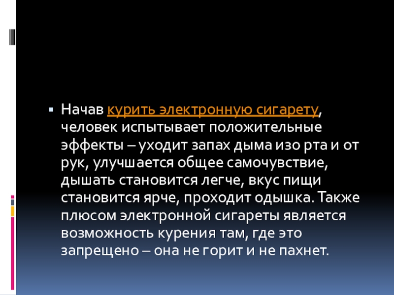 Начав курить электронную сигарету, человек испытывает положительные эффекты – уходит запах дыма