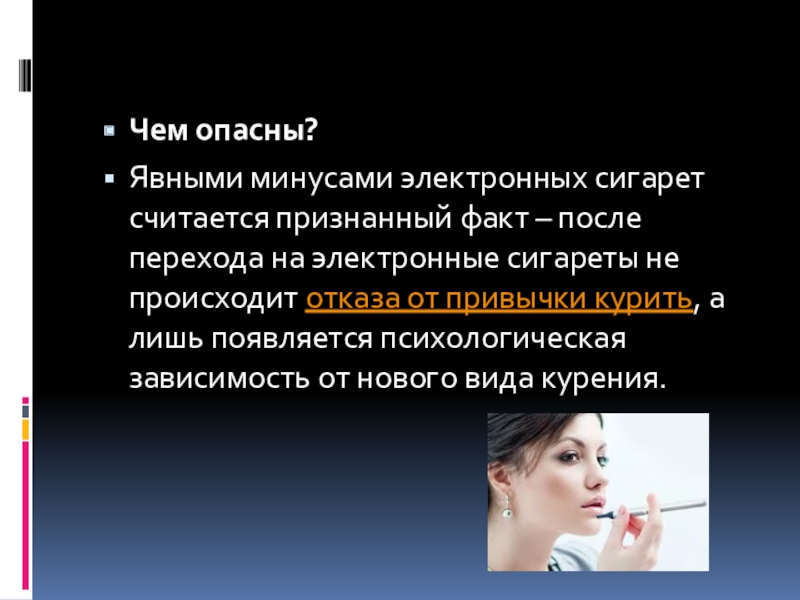 Явными минусами электронных сигарет считается признанный факт – после перехода