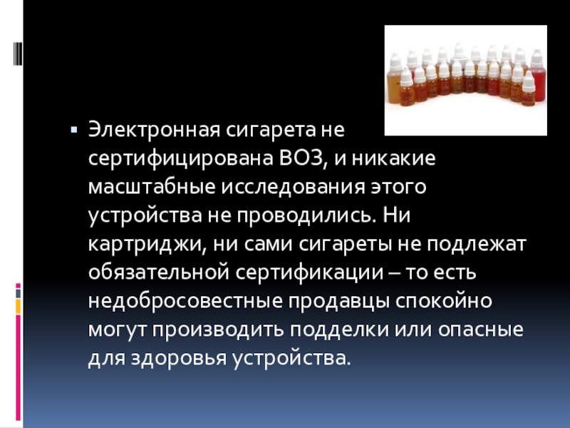 Слайд 10Электронная сигарета не сертифицирована ВОЗ, и никакие масштабные исследования этого устройства
